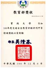 | 各級學校交通安全是教育部極為重視的業務,為要求國內大學提升交通安全軟硬體設施,維護一定品質,教育部特制定交通安全評鑑辦法,定期赴各大學審視辦理情形。由於本校教職同仁的努力,100年度交通安全評鑑,本校取得甲等殊榮。 |