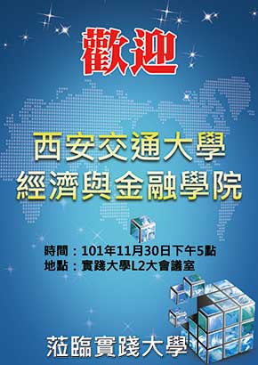 本校管理學院財務金融學系為增進與西安交通大學兩校間的學術交流,特邀請西安交通大學經濟與金融學院來台進行為期8天的參訪,並特別於101年11月30(五)舉行始業式歡迎西安交通大學經濟與金融學院嚴明義副院長、國際處楊衛國主任、團委宣傳部苗潔部長及16位學生至本校參觀。兩校師生互動良好、受益良多,活動圓滿落幕。