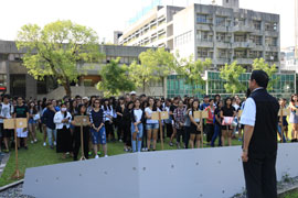9月21日9時21分正式演練當日由陳振貴校長、何康婷學務長、胡寶麟主任祕書及朱世華總教官共同視導演練全部過程,值得一提的是,大直里里長也參與見證本校演練活動,於9時整學務處工作小組成員提前至各集結區執行秩序維護,依「本校演練程序腳本」,經陳校長下達演練任務後,即由校安中心廣播發布狀況一「就地避難掩護」,全體教職員生約2,200人,共同配合實施1分鐘「趴下、掩護、穩住3個要領」;隨後發布狀況二「進行避難疏散」及「火災搶救」,全體教職員工及任課老師、班代引導全體師生疏散至培英公園、L棟及圖書館前草坪集合,此時學校防護團自衛戰鬥編組人員於9時25分至災害現場集合,進行火災搶救。9時45分陳校長於圖書館前草坪對師生實施中、英語雙聲的精神講話,期望參演師生能透過演練瞭解學校疏散避難位置,提升應變處置知能及防災逃生自救能力;發布狀況三「集結區清點人數」,各集結區班代回報人數無誤後,各自返回原班級上課;最後發布狀況四「災害物資發放」,此狀況是今年新安排的演練項目,於9時55分受命後開始聯繫統一便利商店,設置物資登記站與領取站,安排食保系學生逐一排隊領取災害物資後,圓滿完成。 |