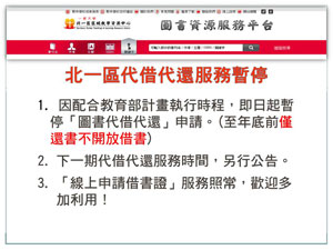 本期北一區「圖書代借代還」服務已暫停;「聯合目錄檢索」與「線上申請借書證」服務照常