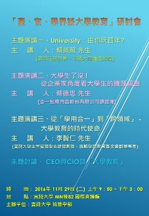 | 105年11月29日辦理「產、官、學界談大學教育」研討會,目前少子化現象所形成校際間搶學生、搶排名及搶計畫的怪象紛呈時,希冀藉由產、官、學界人士的不同視角對「大學教育」應有的正確思維及走向,進行開放式的探討及建議,以期能促進學子、學校、家庭、社會及國家的永續幸福。本次研討會敬邀產、官、學界專家,借重其於各界中的寶貴經驗,提出觀察與建言,提供政府以及關心此議題的社會人士參考,並促成教育環境日臻完善。 |