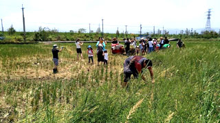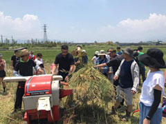 我們有個本身是農友的系友林宏泰,在宜蘭員山有一畝水田(粉絲頁「公家米 吃飯團」),水田裡纍纍的稻穀,汲取了雪山山脈下來的清純湧水,粒粒滿滿飽實,8月初是今年收成的日子。邀請系友會的大家一起來收割,片刻體驗作為稻農的辛苦與欣慰……。汗水淋漓的農忙之後,我們移動到自然湧水冷泉祕境「蓁巷湧泉」休息片刻,泡腳躺水消暑。之後於附近餐廳午餐,享用當季風味料理。下午則靜態活動,去黃聲遠建築師的事務所參觀,以及羅東文化工場參觀建築和展覽。