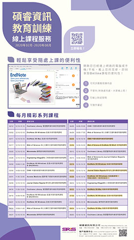 防疫期間,圖書館的資料庫廠商【碩睿資訊】開設了線上的教育訓練課程。本校購買該廠商的資料庫包括:EndNote(Win/Mac)管理軟體、CNKI中國知網期刊資料庫、JCR期刊評比資料庫等 。敬請有需要的師生們自行上網報名,並準時上線參加。下半年校內將不再辦理上列資料庫與軟體講習,敬請把握機會!
