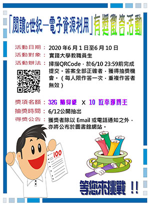 | 數位時代,因應讀者的資訊需求,圖書館裡亦收藏許多紙本之外的電子資源。為了讓全校師生對於圖書館現有電子資源能有更深入的認識,親身體驗電子資源帶來的便利,圖書館在6月初舉辦本學期「閱讀e世紀-電子資源利用有獎徵答」活動。活動自2020年6月1日至6月10日,全校教職員生皆可參加。只要在活動期間掃描活動海報上的QR-code或於圖書館網頁上找到本項活動之網址,進行作答並提交,答案全部正確者,將有機會獲得32G隨身碟一只。圖書館將於6月12日公開抽出10位幸運得主。每人限作答一次,重複作答者無效。圖書館未來也將持續舉辦相關活動,讓讀者更清楚圖書館內可資利用的各項資源。    |