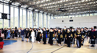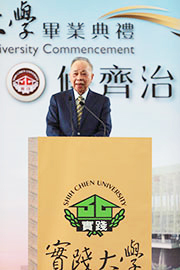 最後,當畢業歌樂聲響起,全體畢業生在依依不捨的氛圍下,與師長、同學互道珍重再見。典禮尾聲在充滿祝福的話語中圓滿畫下句點,畢業生們相互以「鵬程萬里、逐夢踏實」期勉,並自我期許今日我以實踐為榮,他日實踐能以我為榮。