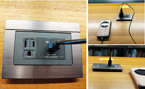 圖書館為提供讀者更優質便利的閱覽環境,同時滿足讀者使用筆電的需求,於圖書館1F閱覽桌,增設16組插座(含一般插座+USB插座)。圖書館原於各樓層閱覽桌下,均設有充電插座,惟1F閱覽桌缺乏充電設備,為使讀者於使用筆電、平板電腦與智慧型手機進行查檢網路資源或文書處理等功能時,不因電池消耗而影響資料查閱及存取,因此於該樓層增設電源插座,以滿足讀者自身資訊設備充電需求。